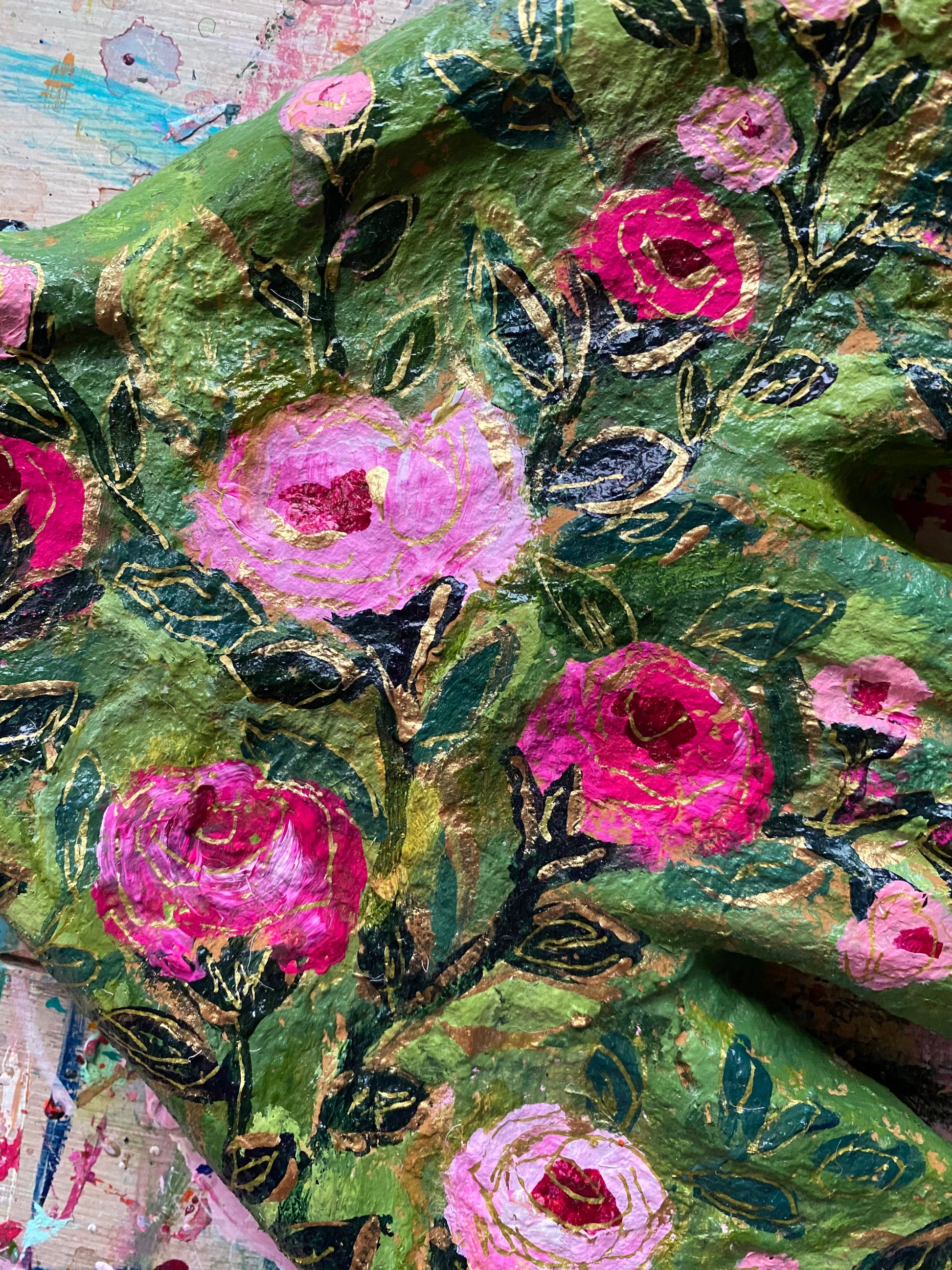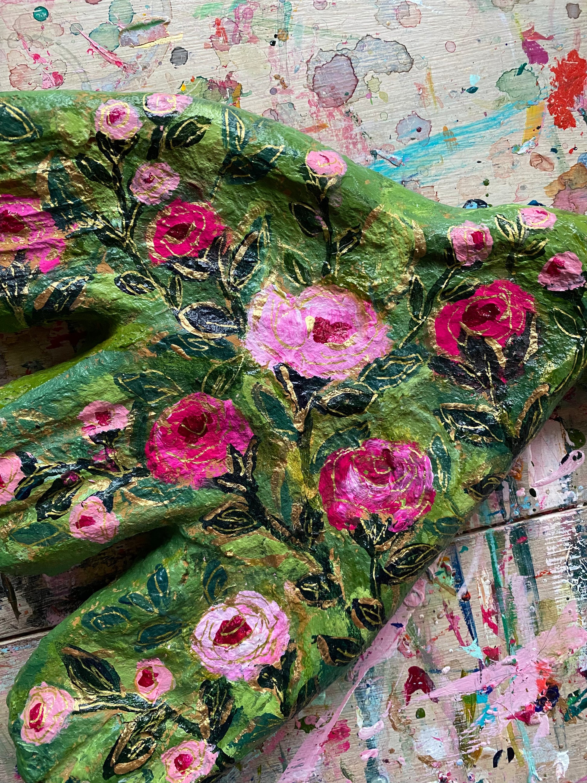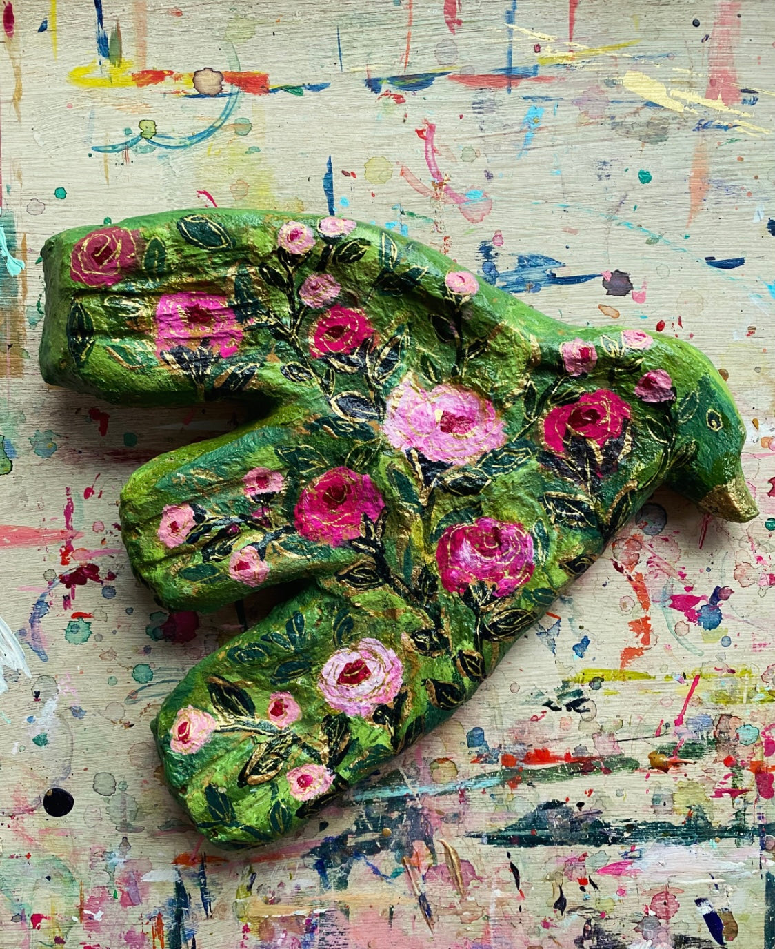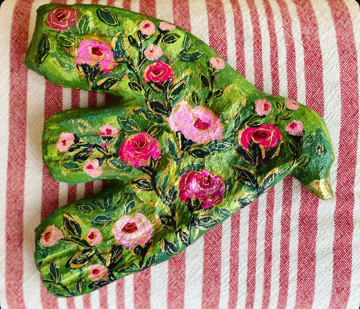 Hand-painted by Carrie Schmitt on paper mache form that measure about 9x9 inches.